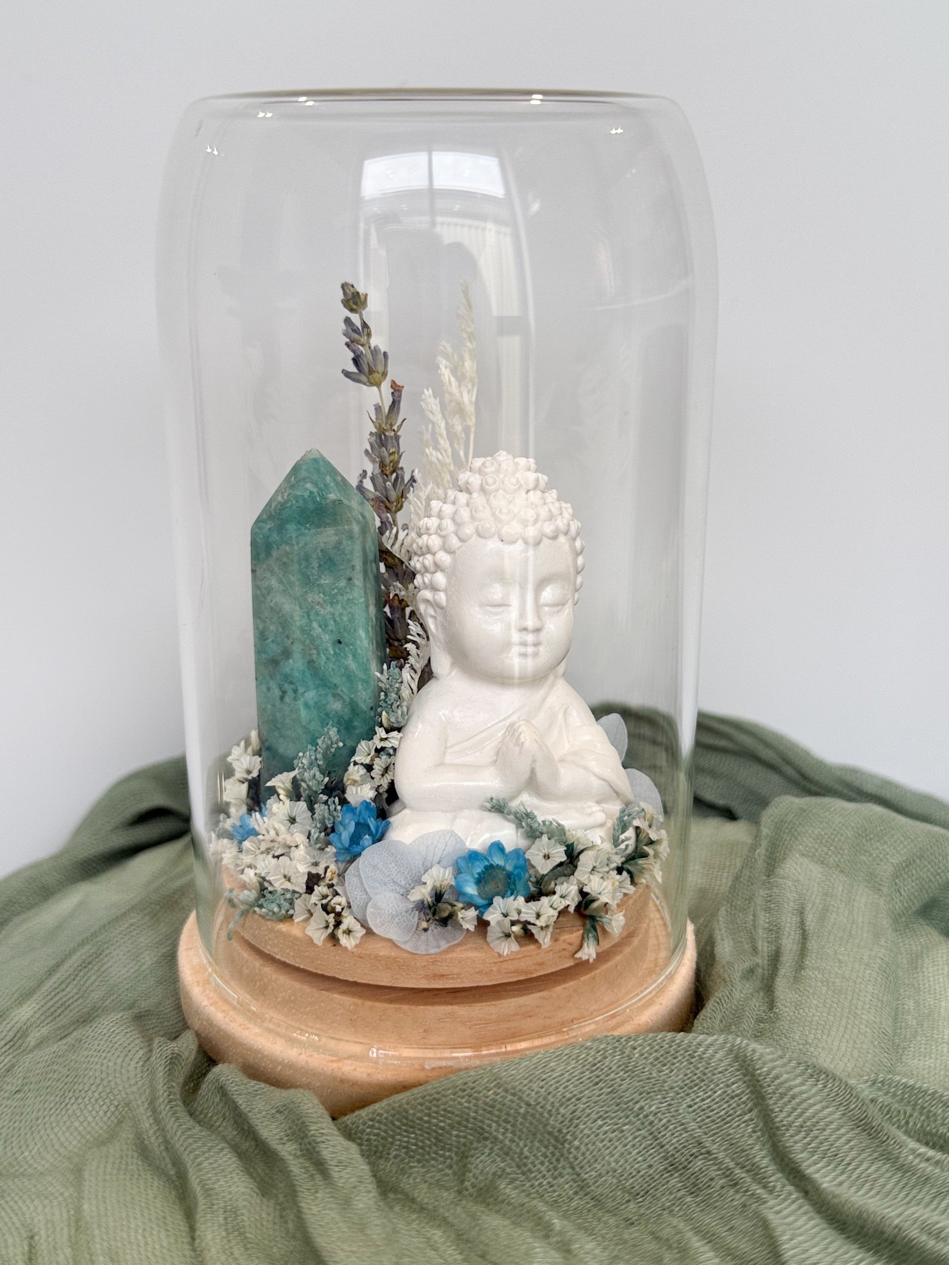 This crystal dome features a beautiful Amazonite point surrounded by soft blue and white dried florals. Amazonite carries soothing energy — bringing balance, truth, and calm to the chaos. Display it as a gentle reminder to speak with clarity, move with ease, and stay connected to your inner flow.