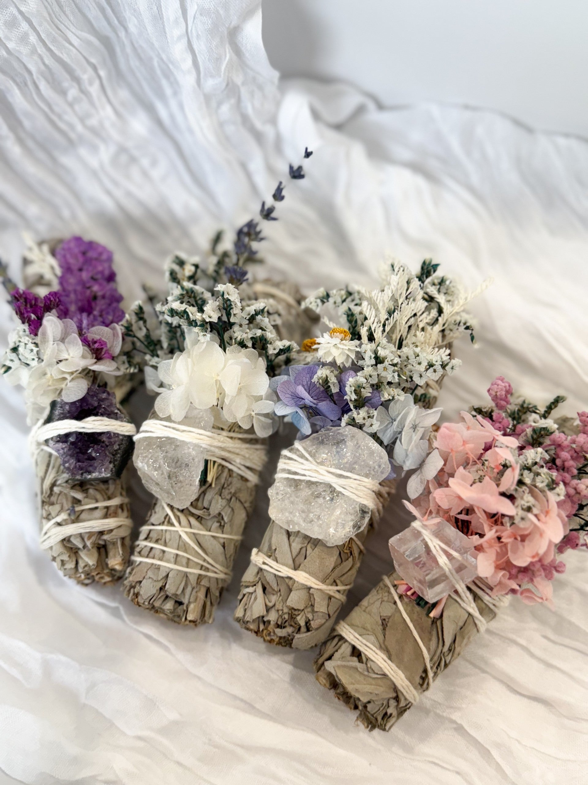 Each handcrafted sage bundle is a little piece of magic — featuring white sage, dried blooms, and a crystal chosen to bring balance and calm. Wrapped with care and intention, these bundles infuse any space with gentle beauty and a touch of natural enchantment.